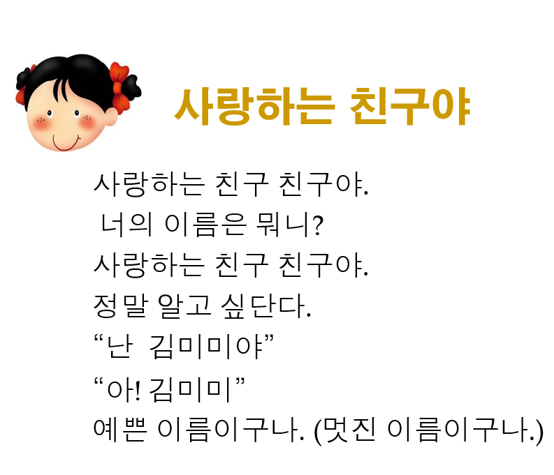 출석 체크 손유희로 사용할 때는 '너의 이름은 뭐니?'부분에서 교사가 아이를 한명 지목하면 그 아이가 ' 난 이미미야'라고 하고, 아이들이 다 같이 '아~ 이미미'라고 복창하게 한 뒤 함께 '예쁜이름이구나'라고 같이 부르고, 반 친구들의 이름을 다 체크 할 때까지 반복해서 부르면 된다.