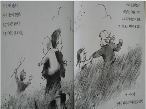 역시나 그림은 전면에 배치해 두되 글은 그림을 헤치지 않는 선에서 보기 좋도록 왼쪽에 배치 해 두었다. 이 페이지를 컬러로 그린 것은 넘실대는 기다란 풀잎을 그냥 헤치고 지나가서 문제를 해결했음을 의미한다. 사각 서걱! 의 글씨 크기가 점점 커지는 것은 문제 해결책을 찾기는 찾았으나 그래도 처음엔 조심스럽게 헤치고 지나가는 감정을 담고 있고, 마지막에 커다란 글씨를 표현 함으로써 자신감을 얻어 용감하게 풀밭을 헤치고 나가게 됨을 표현 해 주고 있다. 이런 방식으로 이 책은 문제 상황에 직면했을 때 흑백, 해결했을 때 컬러, 점점 용기가 생김을 글씨 크기로 표현 함으로써 장문의 글로 표현하지 않고, 많은 이야기를 표현하고 있다.