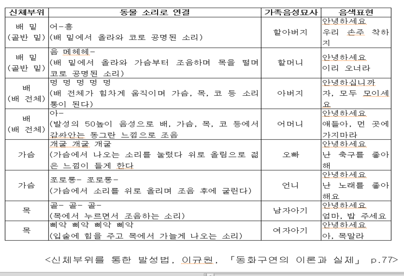 소리의 높이를 3단계로 나누어 발성해 보며, 구연자 자신의 낮은음, 중간음, 높은음을 감지한다.