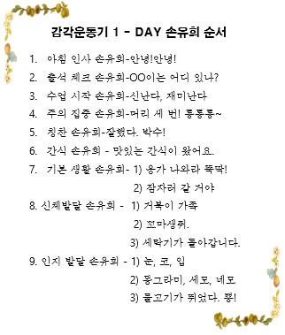감각운동기 1 - DAY 손유희는 아침인사 손유희, 출석 체크 손유희, 수업시작 손유희, 주의 집중 손유희, 칭찬 손유희, 간식 시간 손유희, 기본 생활을 위한 손유희, 신체 발달을 위한 손유희, 인지 발달을 위한 손유희가 있습니다. 가사는 따로 파워포인트로 정리해서 파일첨부해 놓도록 하겠습니다. 앞으로 이 곳에 올라온 자료 순서대로 동영상을 올려드리도록 하겠습니다.