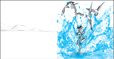 이수지 작가는 대부분의 작품에서 '책의 접힌 면'을 현실과 상상의 경계선으로 사용한다고 했다. 또 색깔을 매우 상징적으로 쓰는데, 그림을 먹선으로만 쓰다가 아이가 파도에 마음을 여는 순간 세상을 파도와 같은 하늘색 빛깔로 그려낸다.