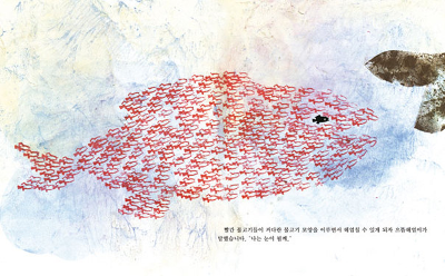 빨간 물고기가 많이 사는 깊은 바다 어딘가에 배고픈 다랑어가 오면서 위기를 맞게 되고, 외롭고 혼자였던 딱 한마리의 검은 물고기의 지혜로 위기를 모면하는 이야기 「으뜸헤엄이」는 찍기 기법이 들어간 레오 리오니의 그림책이다.